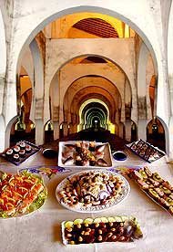 La mesa sefardí se abre con un variado surtido de entremeses, el mezé, que suelen tomarse con ‘raki’, una especie de aguardiente anisado parecido al ‘pastis’, que reconforta maravillosamente el estómago. Incluso en la farmacopea doméstica se usa para aliviar lo que llaman males de la boka del korason, y que son desde el dolor de muelas hasta la aerofagia, pasando por la gastritis, úlceras y demás enfermedades relacionadas con el aparato digestivo. Esta especie de aperitivo se toma en casa cuando hay alguna celebración religiosa o familiar, también se puede hacer fuera, en algún bar donde se reúnen los amigos y de algún modo dejan ya casi solucionada la comida. Los platos más habituales suelen ser los fritos de calabaza y berenjena, las ‘filikas’ o especie de empanadillas rellenas de varios quesos, huevos y especias; el ‘djadjik’, que es como una sopa de yogur con pepino y menta aliñado con aceite de oliva y vinagre; la ‘tarama’, pasta preparada con huevas de pescado secas, miga de pan, cebolla cruda y aliño de limón y aceite; los ‘vahtes’ o ‘garato’, que son pescados azules salados y conservados en aceite como nuestras anchoas; la ‘tuna’, escabeche de bonito preparado con limón en vez de vinagre; el ‘plaki de avas’, un estofado de habichuelas blancas que se come frío revuelto con una ensalada de hortalizas y un sinfín de ensaladas de remolacha, berenjenas, calabacines, col, coliflor, escarola, achicoria, judías verdes, habas, pepino, rábanos, pepinillos, sesos, etc.